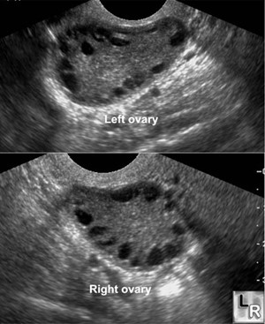 (1)男性賀爾蒙過高 (2)月經週期異常 (3)超音波上有多囊型態以上有兩項即可被診斷為多囊性卵巢症候群。