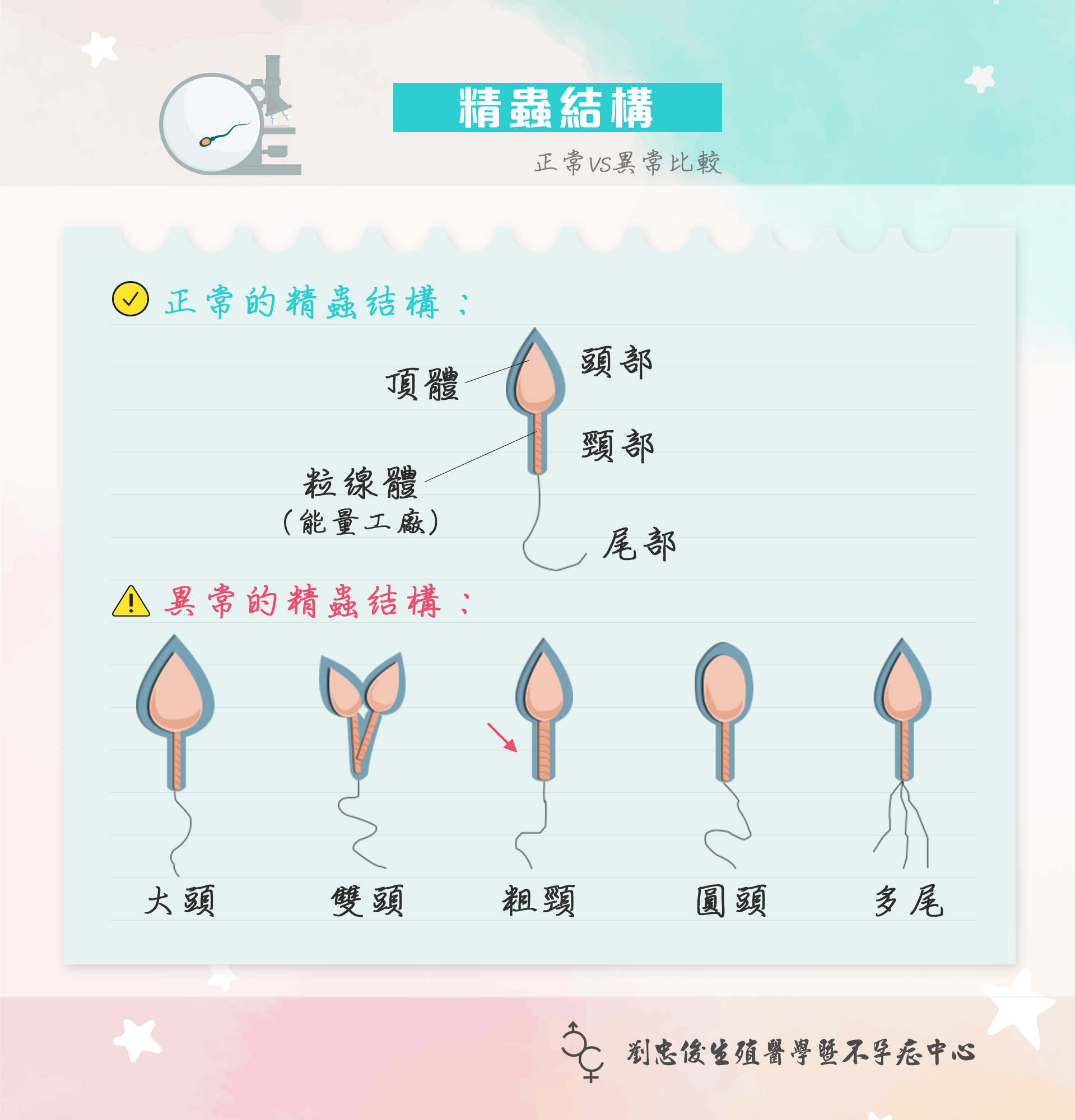 | 精液分析 | 以新鮮精液檢查其精子濃度(>15×106)、數量(>1.5ml)、活動力(次優+優>80%)、外型(僅供參考)、是否有過感染(<1M/ml),評估合適療程,為男性重要檢查。 |